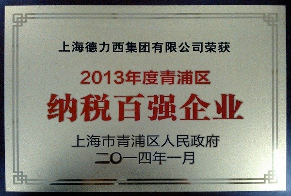 2014 年1 月24 日,2013年度青浦區(qū)納稅百強企業(yè)表彰會在青浦工業(yè)園區(qū)隆重舉行。青浦區(qū)委書記高亢,區(qū)委副書記、區(qū)長趙惠琴等領(lǐng)導(dǎo)出席表彰會。上海德力西集團(tuán)被授予“2013 年度上海市青浦區(qū)納稅百強企業(yè)”榮譽稱號。上海德力西集團(tuán)監(jiān)事會副主席林少東出席大會領(lǐng)獎。